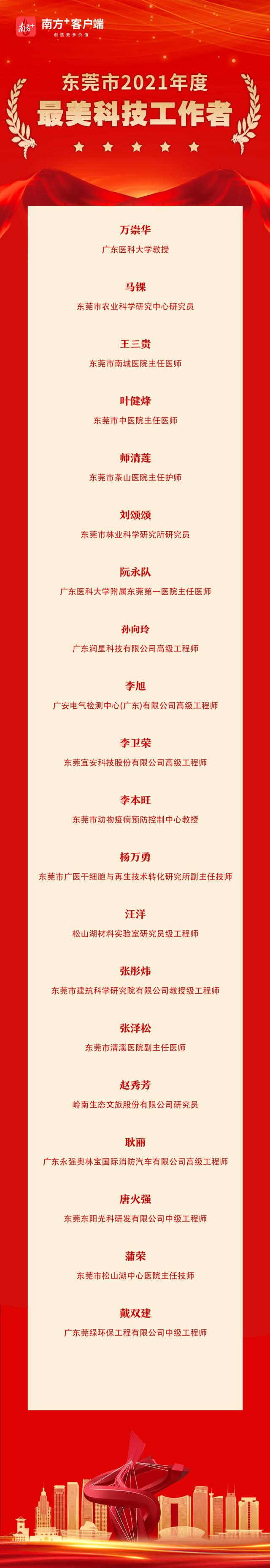 东莞市2021“最美科技工作者”名单如下: