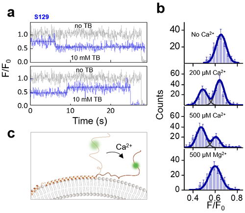 研究团队以单层脂质体中包裹的台盼蓝染料(TB)作为荧光受体,以膜蛋白上标记的荧光基团作为荧光供体,结合理论计算建立了膜蛋白特定位点的垂直位置与相对荧光亮度的对应关系(图1)。对单个α-syn蛋白上三个代表性位点的研究表明,α-syn的中间区域(T72)位于脂质体磷脂膜的外表面,C端的无结构尾部(S129)位于溶液中,而N端(K10)插入膜中并呈现多态的特性,其深度在各个状态之间缓慢切换(图2)。研究人员还对α-syn的C端与钙离子的相互作用进行了研究(图3)。结果显示,钙离子使部分标记在129位点的荧光基团出现了一个比原始位置更靠近膜表面的新状态,两态之间的高度差约为1.2-1.6 nm。该状态所占比例随着钙离子浓度的升高而相应增加,而相应浓度的镁离子则不会诱导α-syn的C端发生变化,清楚地揭示了钙离子对α-synC端的特异性调控作用。这一成果近期发表在Angewandte Chemie International Edition(2019, 58,5577-5581)上。