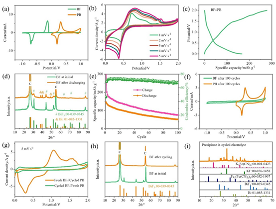 离位XRD和XPS表征结果表明,在BFO//PB电池放电过程中,在BFO电极中金属铋发生氟化反应生成氟化铋,同时钾离子插层进入PB电极;BFO//PB充电过程中,BFO电极中发生去氟化反应先生成氟氧铋最终转化为单质铋,同时钾离子在PB电极中脱出进入电解液。