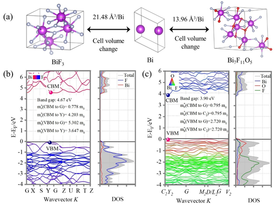 图2 (a)BiF3 和Bi7F11O5物相在转化过程中的体积变化示意图;(b)BiF3 和(c)Bi7F11O5物相的能带和态密度曲线。