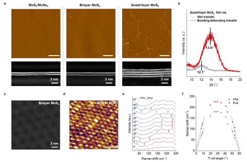 针对此挑战,团队开发的直接晶圆键合及解键合方法,可在真空或手套箱中进行,无需转移介质,可实现超洁净表面/界面和晶圆级均匀的转角。从蓝宝石表面外延的单层二硫化钼和二硒化钼等晶圆级二维半导体出发,该方法可制造多种同质和异质叠层晶圆。如图1所示。原子力显微镜、扫描透射电子显微镜、拉曼光谱、X 射线衍射、低能电子衍射和二次谐波等表征结果显示,所制备的二维半导体叠层具有高质量、超洁净表面/界面以及晶圆级均匀的层间转角(图2和图3)。