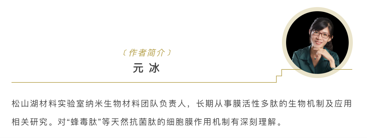 蜂毒肽(黄色和红色)如何插入和破坏细胞膜(绿色和橙色分别为膜的外表面和内表面)。(图片来自作者早期学术论文)
